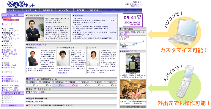 グループウェアを活用すると、「パソコン」「モバイル」「携帯電話」といった現代の世界ではもはや当たり前になった媒体から、「誰もが」「いつでも」「どこでも」「同じ情報を」得ることが可能となります。このシステムを用いて本当の意味でのコミュニケーションを是非体験し、御社の活性化にご活用下さい。